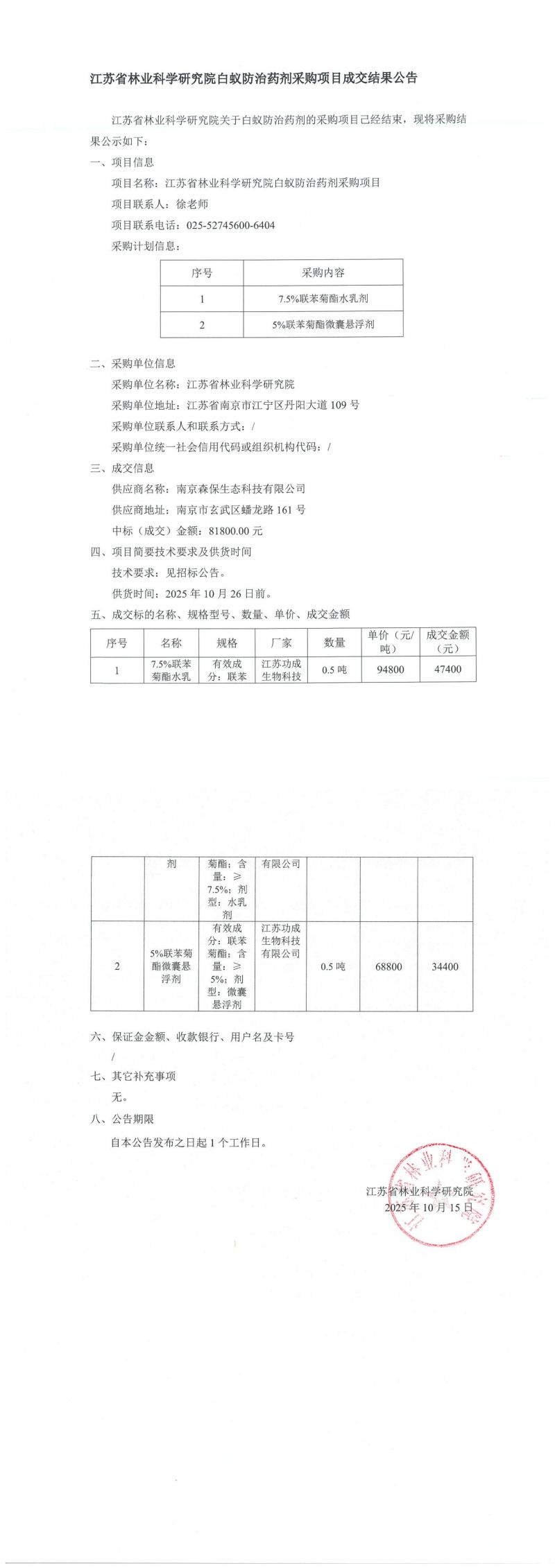 为更好地实施“林木白蚁综合治理技术集成与示范”项目,我院需采购一批白蚁防治药剂,为降低采购成本,提高采购质量,参照《中华人民共和国政府采购法》《中华人民共和国政府采购法实施条例》等有关法律法规的规定本着公开、公平、公正的原则。我院拟对白蚁防....